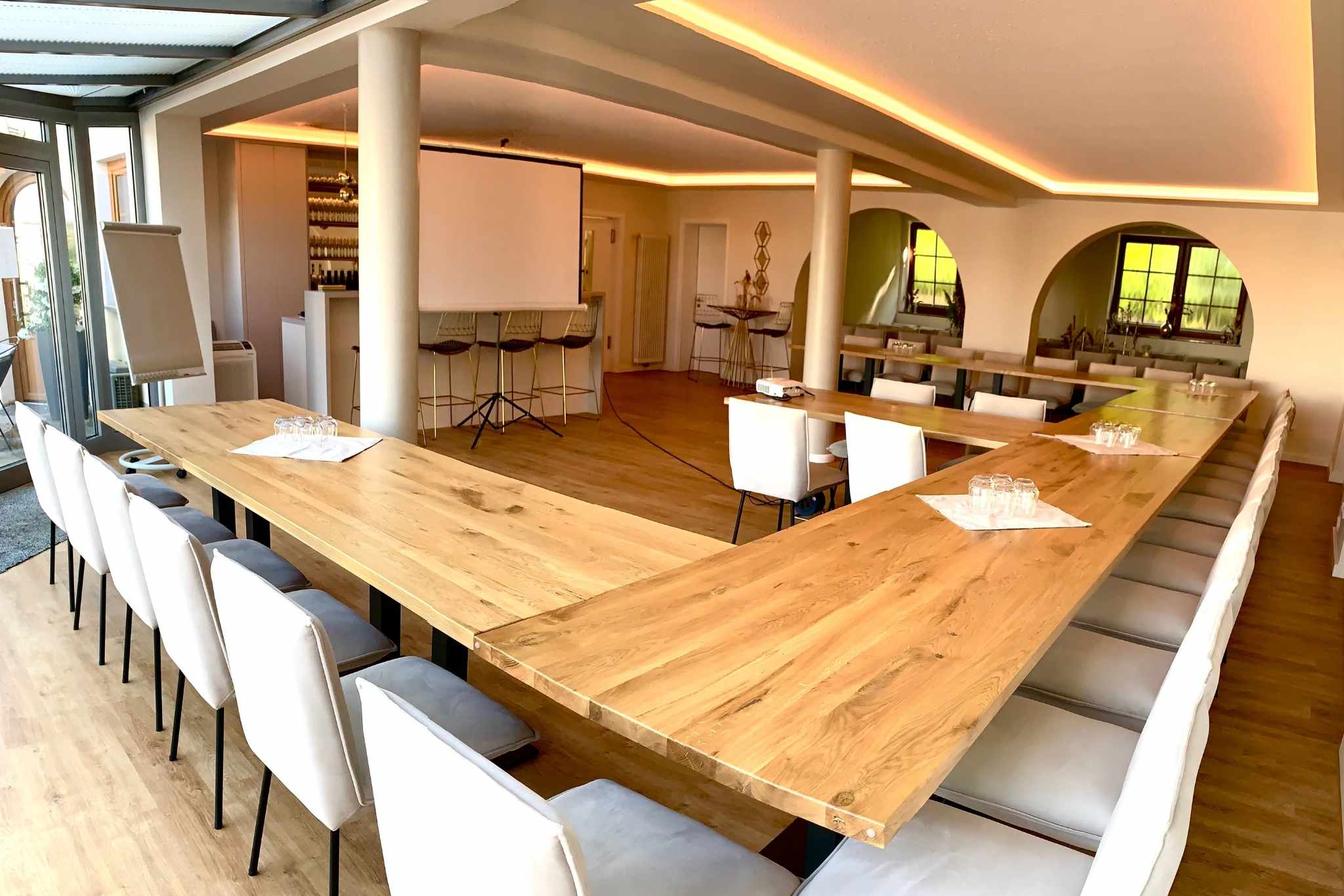 Als Seminarraum bei Bad Kreuznach eignet sich unsere Vinothek für verschiedenste Veranstaltungsformate. Bei Reihenbestuhlung finden hier bis zu 79 Personen Platz, während für Workshops, Schulungen oder Besprechungen je nach Tischordnung ca. 30 Teilnehmer komfortabel untergebracht werden können. Die flexible Bestuhlung und moderne Tagungstechnik machen unsere Vinothek zu einem vielseitigen Tagungsraum in Rheinhessen.